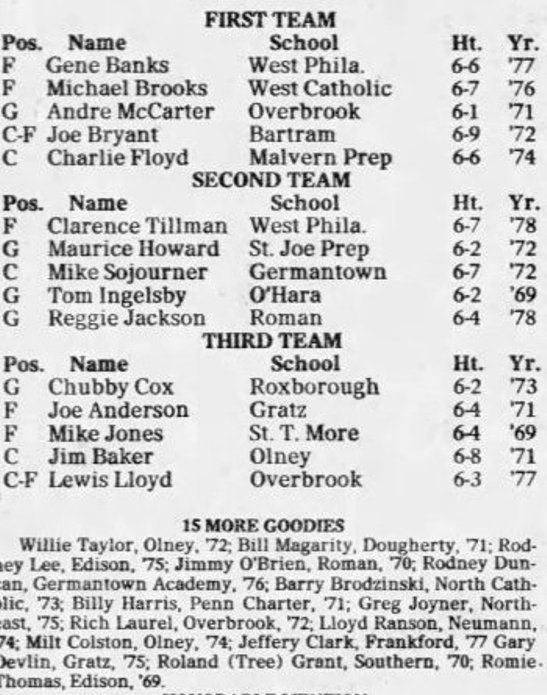 Philadelphia High School Basketball All-City Team Over a 10-Year Period, 1969-78