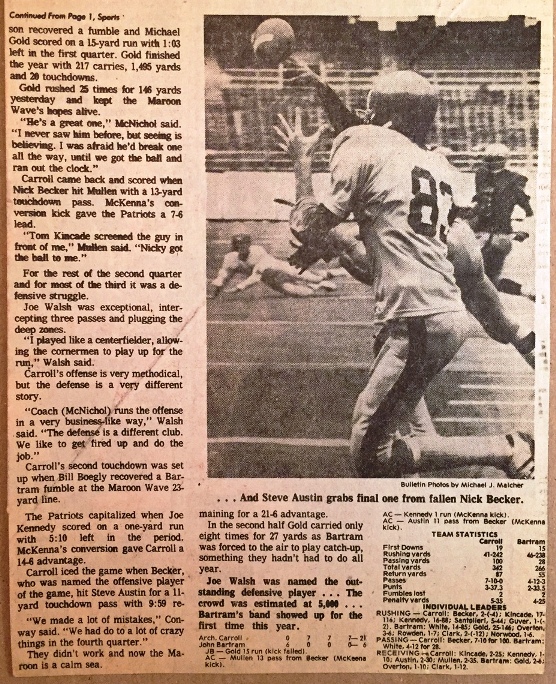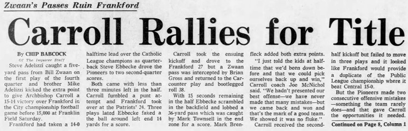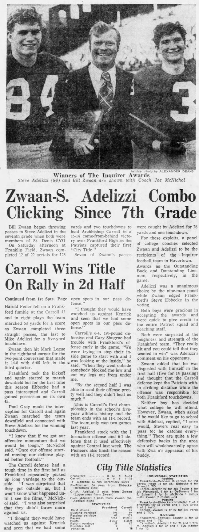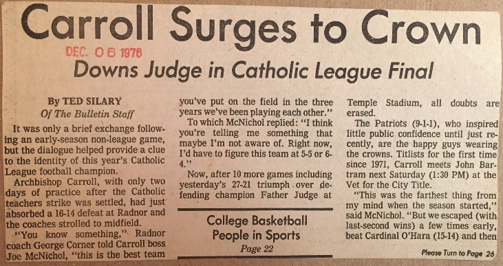 Tribute Page Carroll's Double Titles In 1971 and 1976 Under coach Joe McNichol, Archbishop Carroll won the Catholic League championship and City Title in 1971 (just third league season) and 1976. The '76 CT was won against John Bartram, which had earned major attention while racking up shutouts in nine of its 11 games. Here is that story . . .