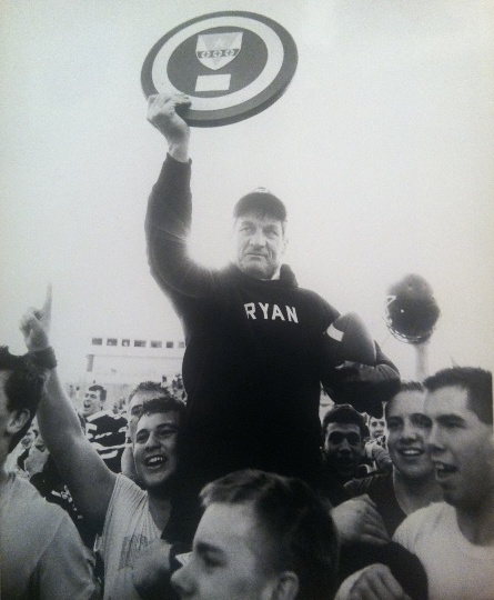 His father's eyes springing a leak after Ryan - on 24- and 42-yard first- half field goals by Matt Knowles - had won its first football championship in 21 seasons of Catholic League membership. His father being carted off the field by delirious players. His father being engulfed by media members, most of whom were not ashamed to feel pleased that a title had finally come John Quinn's way.