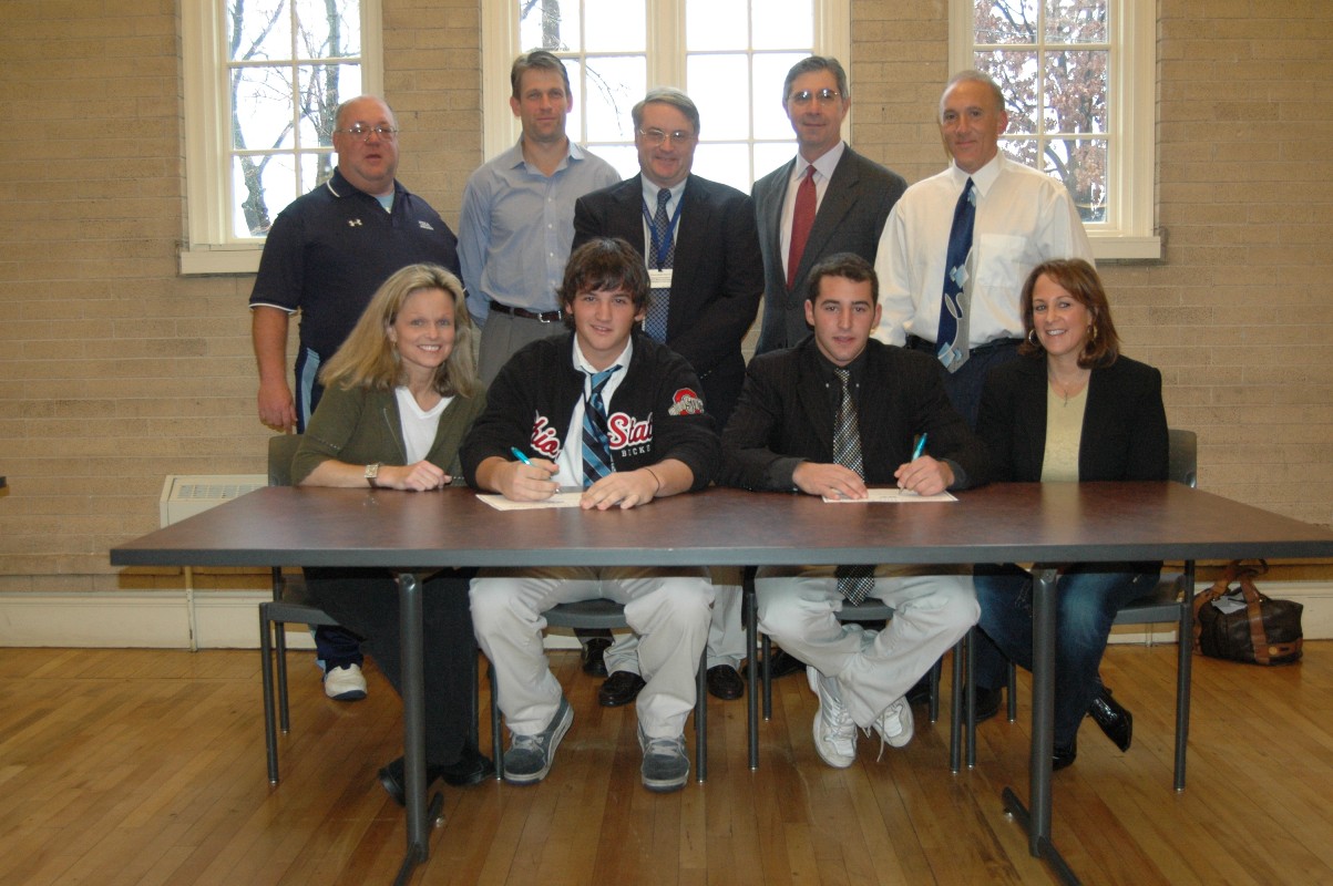 CHA Signees On 11/13/2008, Chestnut Hill Academy baseball players Steel Russell (catcher, Ohio State) and Brandon Sady (second base, Lehigh) signed their letters of intent with coaches and parents on hand. Look below for a photo, courtesy of Deidra Lyngard, director of communications and marketing. |